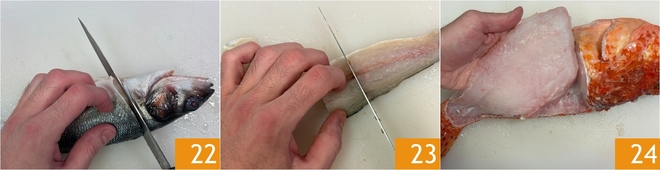 Para preparar la bouillabaisse comenzad por la limpieza del pescado, cuidando de conservar todos los desperdicios. Cómo limpiar la lubina: eliminad la cabeza 22, realizad un corte en el lomo y evisceradla, luego sacad los filetes 23, quitad las espinas y cortad los filetes en pequeños trozos 23. Cómo limpiar el cabracho: eliminad las aletas y la cabeza, filetead 24 y cortad la barriga.