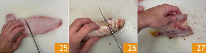 Dividid también los filetes de cabracho en trozos más pequeños 25. Ocupaos de las salmonetes: eliminad la cabeza 26, realizad un corte en el lomo y abridlas en forma de libro para obtener los filetes 27, luego eliminad la barriga. También en este caso obtened trozos.