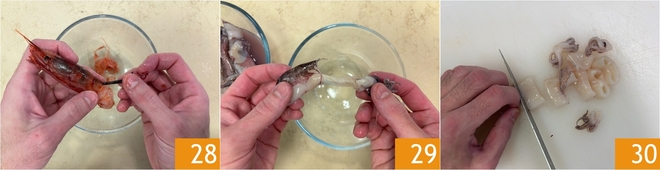 Cómo limpiar los gambones rojas: eliminad el caparazón y dejad la cabeza y la cola, luego extraed el intestino y reservadlas 28. Para finalizar Cómo limpiar los calamares pequeños eliminando el cartílago interno y las vísceras 29, luego cortadlos en tiras 30.