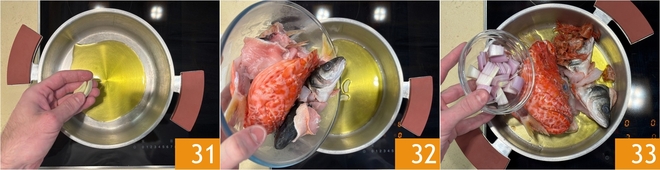 Preparad el Caldo de pescado: en una cacerola verted un chorrito de aceite y el ajo sin el germen 31, añadid todos los desperdicios de la limpieza de los pescados 32 y la chalota pelada y cortada en trozos 33.