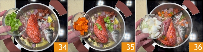 Añadid también el resto de las verduras peladas y cortadas en trozos: el apio 34, las zanahorias 35 y la cebolla 36.