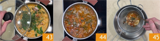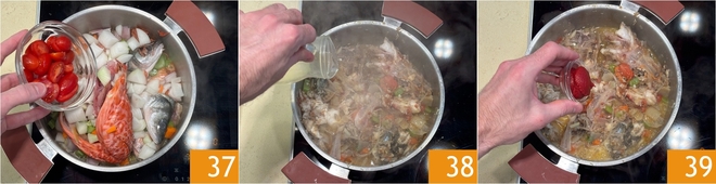 Cubrid con la tapa y coced a fuego lento durante 40 minutos 43. Al final de la cocción 44, filtrad el caldo de pescado 45 y reservadlo.