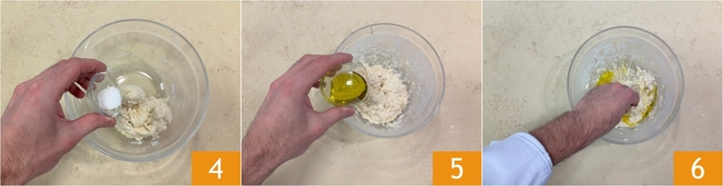 Continuad mezclando, vertiendo poco a poco el resto del agua. Añadid ahora la sal 4 y la mitad del aceite 5, luego comenzad a amasar a mano 6.