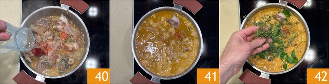 Cubrid con el agua 40 y mezclad para disolver el concentrado 41, luego sazonad con las hierbas aromáticas: albahaca, mejorana y tomillo 42.