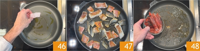 Pasad a la cocción del pescado: en una sartén verted un chorrito de aceite, colocad los trozos de cabracho, salmonetes y lubina 46 y dorad por ambos lados hasta que estén dorados 47. Retiradlos de la sartén e introducid las gambas rojas 48.
