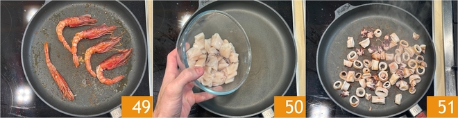 Saltead también estas hasta que estén doradas 49 y reservadlas. Siempre en la misma sartén, dorad los calamares 50 hasta que estén dorados 51, luego reservadlos.