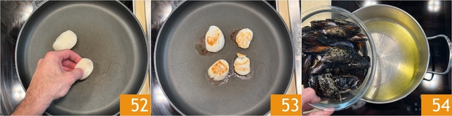 Colocad en la misma sartén las vieiras 52 y doradlas hasta que estén doradas 53. Reservad también estas. Ocupaos de los mejillones: en una cacerola calentad un chorrito de aceite, luego verted los mejillones limpios 54.