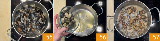 Cubrid con la tapa y coced a fuego alto hasta que se abran 55. Haced lo mismo para las almejas 56 y coced justo el tiempo necesario para que se abran 57.