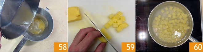 Filtrad el fondo de cocción de mejillones y almejas y reservadlo. Ahora pelad las patatas y cortadlas en cubos de 1 cm 59. Escaldadlas durante unos minutos y reservadlas 60.