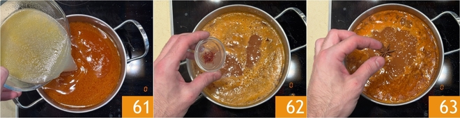Ahora añadid al caldo de pescado 300 g del agua de cocción de mejillones y almejas 61, luego llevad al fuego y aromatizad con el azafrán 62 y el anís estrellado 63.