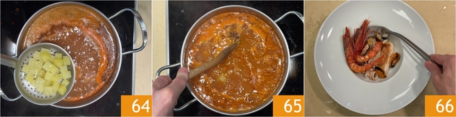 Añadid finalmente las patatas 64 y continuad la cocción durante 2-3 minutos. Todo está listo para componer los platos: en el fondo colocad todos los pescados y mariscos 66.