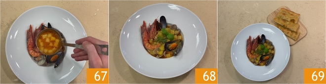 Cubrid con el caldo de pescado 67 y completad con hojas de albahaca, hinojo silvestre y harina de pistachos 68. ¡Vuestra bouillabaisse con focaccia genovesa está lista para servirse 69!