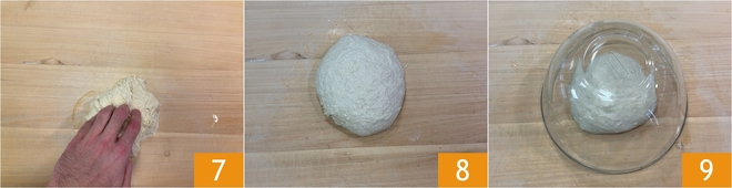 Una vez absorbido el aceite, trasladad la masa a la encimera 7, realizad pliegues tirando de la masa y doblándola sobre sí misma, y poco a poco añadid la parte restante del aceite. Cuando hayáis obtenido una bola lisa y homogénea 8, cubridla con el bol y dejad reposar durante 15 minutos a temperatura ambiente 9.