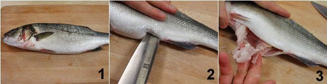Para preparar la lubina en costra de sal, hierbas y cerveza, comienza por eviscerar la lubina 1 insertando el cuchillo en el orificio situado cerca de la cola 2 y cortando hasta la cabeza. Vacía su vientre 3 y luego enjuaga la lubina bajo agua corriente.