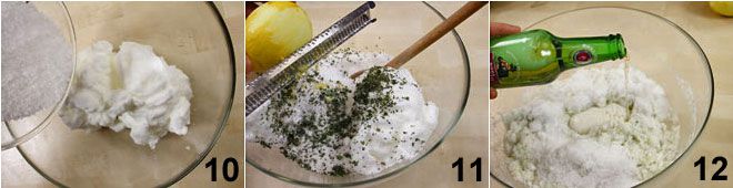 Incorpora delicadamente a las claras la sal fina y gruesa 10, el picadillo de hierbas aromáticas restante y ralla la cáscara de la otra mitad del limón 11, luego une y mezcla todo añadiendo tanta cerveza 12 como sea necesario para obtener una mezcla densa y cremosa.