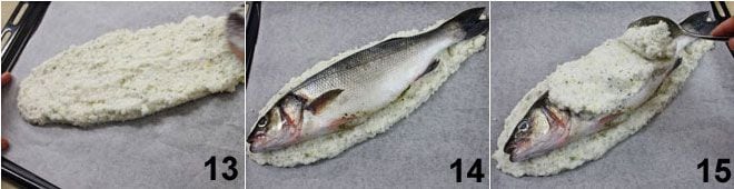 Extiende una hoja de papel de horno en una bandeja (o molde) y luego coloca una capa delgada (aproximadamente 1,5 cm) de la mezcla obtenida, que formará el lecho de cocción para la lubina 13. Coloca luego la lubina encima del lecho de sal 14 y cúbrela con la mezcla de sal presionándola suavemente para que se adhiera bien a la masa 15.