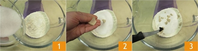 Para preparar las brioches, comienza con la masa. En el bol de una batidora equipada con gancho, pon la harina y el azúcar 1. Añade la levadura desmenuzada 2, las semillas de una vaina de vainilla 3