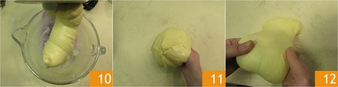 Cuando la masa esté de nuevo ligada 10, transfiérela a una superficie 11. Puede resultar muy pegajosa: da un par de dobleces tipo slap & fold, sin golpearla. Para hacerlo, bastará con levantar la masa delicadamente, alargarla y doblarla sobre sí misma 12. Si resultara demasiado pegajosa, espera dos minutos y repite la operación de los dobleces.