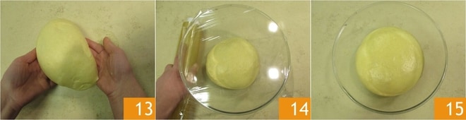 Luego, bolea la masa ayudándote con una rasqueta para despegarla bien de la superficie y formar una esfera 13, transfiérela a un bol amplio. Cubre con film 14 y deja que la masa fermente a una temperatura entre 26 y 28°C durante 3 horas y media. Lo ideal sería en un horno apagado con la luz encendida y un cazo de agua caliente en el fondo del horno. Si no tienes esta oportunidad y la dejas a temperatura ambiente, protegida de corrientes de aire, con una temperatura inferior a la indicada, podría ser necesario un tiempo mayor. Una vez que la masa haya doblado su volumen 15,