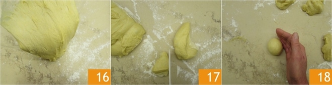 transfiérela y voltea sobre la superficie de trabajo 16 y saca 18 piezas de 50 g 17. Toma la primera porción y da fuerza a la masa haciendo rápidamente unos dobleces, levanta un borde externo de la masa y llévalo hacia el centro. Repite esta operación varias veces. Bolea los trozos de masa rápidamente para obtener bolitas 18.