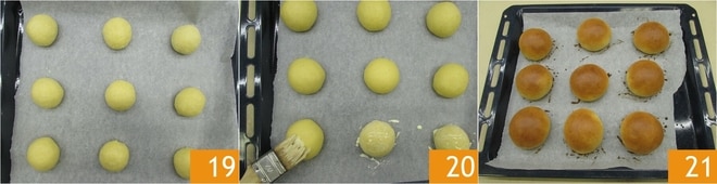 Coloca en una bandeja cubierta con papel de horno 19. Deja fermentar nuevamente durante una hora. Bate la yema con un poco de nata y úsalo para pincelar la superficie 20. Hornea en horno estático precalentado a 180°C durante 20 minutos. Retira del horno 21, deja templar y sirve.