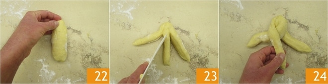 Como alternativa a las bolitas, también es posible crear trenzas. En este caso, necesitarás una mayor cantidad de masa. Para cada trenza, de hecho, necesitarás unos 90-100 g. Modela la masa para obtener una barra 22, utilizando un cuchillo o una rasqueta, corta la barra de manera que obtengas 3 tiras unidas en la base, es decir, no debes cortarlas hasta el final 23. Comienza a trenzar los extremos 24