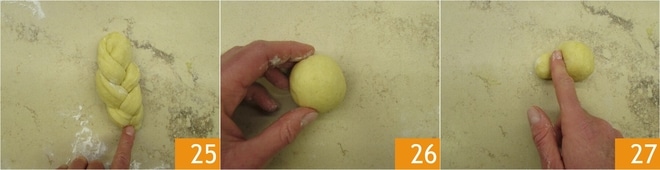 para obtener tus trenzas 25. Además de las trenzas, podrás hacer también pequeñas brioches con un pequeño moño. Toma unos 40-50 g de masa y forma una bolita 26. Luego, con el dedo índice, modela la bolita para obtener dos, una de las cuales más pequeña 27.