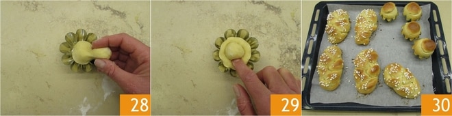 Transfiere dentro de un moldecito festoneado 28 y aplasta ligeramente la parte inferior 29. Luego, deja que fermenten tanto las trenzas como las brioches con moño durante una hora, pincela la superficie con yema y nata y decora las trenzas con azúcar en grano. Las trenzas tendrán un tiempo de cocción mayor (unos 25-30 minutos), mientras que para las brioches con moño bastarán 20 minutos. Retira del horno 30, deja templar y sirve!