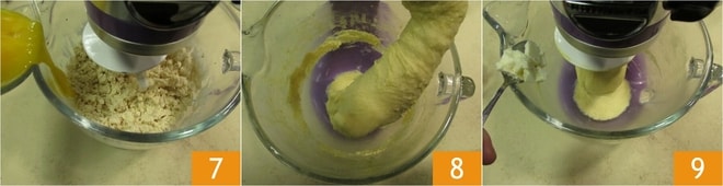 y las yemas, poco a poco, esperando que se absorban antes de proceder con las restantes 7. Continúa trabajando hasta que la masa esté bien ligada al gancho 8. Solo en este punto podrás añadir la mantequilla blanda, pero aún plástica, también poco a poco 9. Espera que un trocito esté bien absorbido antes de añadir otro. No tengas prisa, de lo contrario, la masa tendrá dificultades para volver a ligarse. En esta fase, puedes detener la batidora varias veces y ayudarte con una rasqueta para despegar la masa que tiende a pegarse al bol de la batidora.