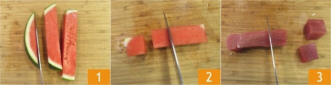 Para preparar las brochetas de atún tataki y sandía, primero cortad la sandía en rodajas de aproximadamente 3 cm de grosor 1, luego eliminad la corteza y sacad 8 cubos 2. Haced lo mismo con el atún para obtener 8 cubos del mismo tamaño 3.