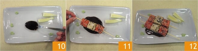 Distribuid una cucharada de salsa en el plato 10 y colocad encima las brochetas 11. ¡Vuestras brochetas de atún tataki y sandía están listas para ser servidas 12!