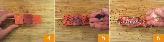 Insertad un cubo de sandía en un pincho de madera para brochetas, luego añadid un cubo de atún y otro de sandía 4. Montad de este modo las otras 3 brochetas, alternando siempre 2 cubos de sandía y uno de atún en el centro. Cubrid las brochetas con la mezcla de sésamo negro 5 y blanco 6.