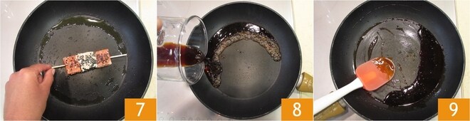 En este punto, calentad bien una sartén con un poco de aceite y dorad brevemente las brochetas a fuego muy alto por todos los lados, por un máximo de 5 minutos 7. Poned las brochetas doradas a un lado y sazonad con una pizca de sal. En la misma sartén, verted la salsa de soja y la salsa teriyaki 8. Reducid la salsa a fuego lento durante unos minutos, solo hasta que espese ligeramente 9.