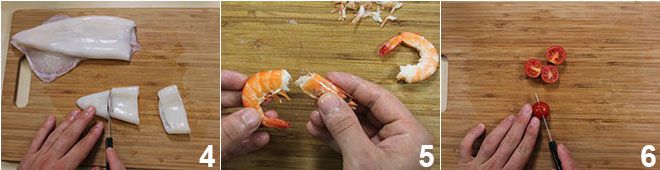 Si tienes calamares enteros, límpialos siguiendo el procedimiento que Cómo limpiar los calamares (Limpieza de calamares). Corta los calamares en tiras de 1-2 cm de ancho 4 y limpia las gambas eliminando la cabeza, el caparazón y dejando la cola 5. Haz un corte, con un cuchillito, en el lomo de cada gamba para eliminar el hilo negro del interior. Corta los tomates a la mitad 6.