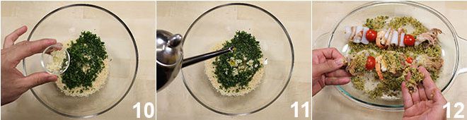 Prepara el empanado: en un bol, mezcla el pan rallado junto con el perejil y el ajo 11, espolvorea con pimienta y añade un chorrito de aceite 11. Pasa las brochetas por el empanado en ambos lados 12.