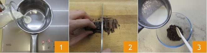 Para preparar las brochetas de panettone con fondue a los dos chocolates, comienza con la preparación de la fondue de chocolate negro. Pon a calentar un cazo con 150 g de nata fresca líquida 1 y, mientras tanto, trocea groseramente el chocolate negro 2 que pondrás en un bol. Añade la nata poco a poco mientras continúas mezclando para que se derrita el chocolate 3.
