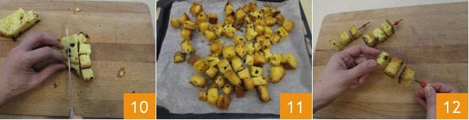 En este punto procede cortando las rebanadas de panettone de igual tamaño de las cuales sacarás cubos grandes 10. Colócalos en una bandeja para hornear cubierta con papel de horno, sin superponerlos para que obtengan una cocción uniforme 11. Hornéalos en horno ventilado precalentado a 190°C durante 8 minutos (o en horno estático precalentado necesitarás hornear a 210°C durante unos 16 minutos). Pasado el tiempo de cocción, toma las brochetas de madera y ensarta tres cubos de panettone en cada una, separándolos ligeramente 12. Repite la operación hasta acabar con todos los cubos de panettone.