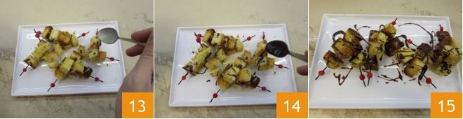 Puedes servir las brochetas de panettone con las dos fondues en cuencos separados o decorarlas directamente dejando caer la fondue de chocolate blanco 13 y negro 14 sobre ellas. Las brochetas de panettone con fondue a los dos chocolates están ahora listas para ser llevadas a la mesa de las fiestas para deleitar a tus invitados 15!