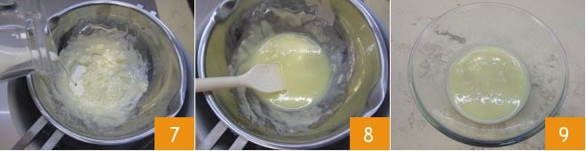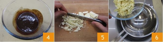 Debes obtener una mezcla suave y homogénea 4 que dejarás a un lado. Luego dedícate a la fondue de chocolate blanco: pica finamente el segundo chocolate 5 y viértelo en un bol que colocarás sobre un cazo con agua que hierva suavemente 6. Si es posible, evita que el agua toque el fondo del bol para derretir al baño maría el chocolate aún más suavemente.