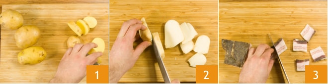 Para preparar las brochetas de patatas, primero lave las patatas, séquelas y luego córtelas en rodajas de 1 cm de grosor 1 eliminando los extremos. Haga lo mismo con el queso scamorza 2 y la panceta 3.