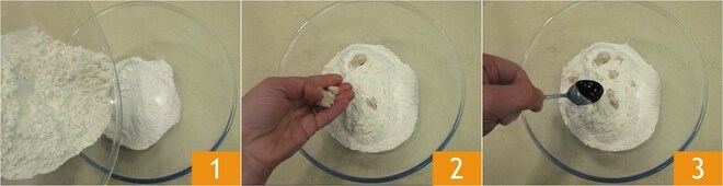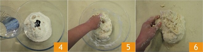 Vierte también el agua 4 y comienza a amasar, primero en el bol 5 y luego en la superficie de trabajo 6.