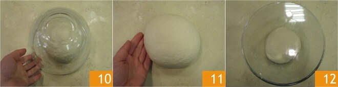 Cuando el aceite esté completamente absorbido, cubre la masa con el bol y deja reposar durante 10 minutos 10. Pasado este tiempo, haz algunos pliegues para reforzar la masa, luego forma una bola 11 y transfórmala al bol, que habrás untado con un poco de aceite. Cubre con film transparente y deja levar a temperatura ambiente durante unas 2 horas o hasta que la masa triplique su volumen 12.