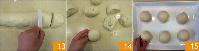 Una vez levado, transfiere la masa a la superficie de trabajo ligeramente enharinada, forma un cilindro y divídelo en 6 porciones de 140 g cada una 13. Redondea cada porción de masa para formar una bola 14 y colócalas bien separadas sobre una bandeja untada con un poco de aceite 15. Cubre con film transparente y deja levar una hora más.