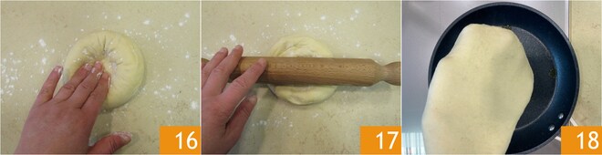 Pasado este tiempo, extiende las bolas sobre la superficie de trabajo ligeramente enharinada para obtener discos de unos 20 cm de diámetro; utiliza primero las manos 16 y luego el rodillo, para uniformar el grosor 17. Estás listo para la cocción: calienta bien una sartén antiadherente con un poco de aceite, luego coloca la pita dentro 18.