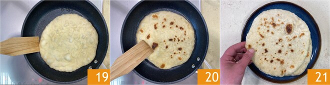 Cocina a fuego moderado hasta que empiecen a aparecer las primeras burbujas en la superficie 19, luego dale la vuelta y deja que se dore también por el otro lado 20. A medida que estén listas, coloca las pitas una sobre otra 21 y cúbrelas con un paño de cocina; de esta manera se mantendrán blandas.