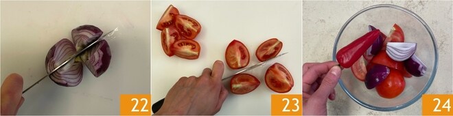 Para hacer las brochetas de pollo, comienza con la marinada: pela y corta la cebolla en 4 partes 22, luego haz lo mismo con los tomates 23. Transfiere cebollas y tomates a un bol junto con el chile entero 24.