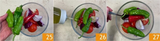 Añade también los pimientos enteros 25 y un poco de aceite 26, luego mezcla bien para condimentar uniformemente las verduras 27.