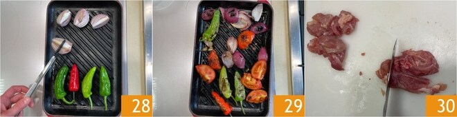Coloca las verduras en una parrilla bien caliente 28 y déjalas asar, girándolas de vez en cuando con unas pinzas de cocina 29. Mientras tanto, corta los muslos de pollo en trozos y reserva 30.