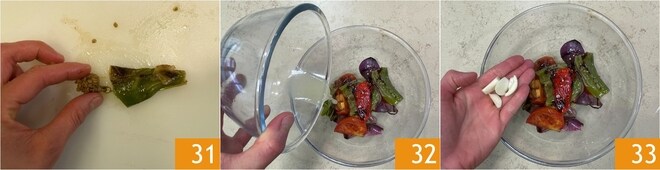 Cuando las verduras estén asadas, toma los pimientos y elimina los extremos y las semillas internas 31, luego haz lo mismo con el chile. Vuelve a colocar las verduras en el bol y vierte el jugo de lima 32, luego añade el diente de ajo pelado 33.