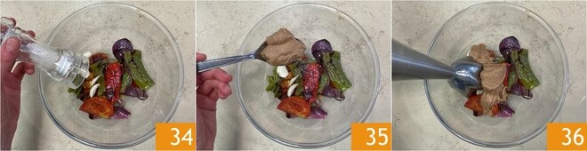 Finalmente, añade una abundante pizca de sal 34 y la mantequilla de cacahuete 35, luego tritura con una batidora de mano 36.